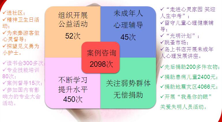 從上圖數(shù)據(jù)可以直觀的看出 自2014年開始,中心接受案例數(shù)據(jù)呈現(xiàn)大幅度增長,這要感謝秦皇島市海港區(qū)文明辦的大力支持;感謝各界媒體的關(guān)注和宣傳。