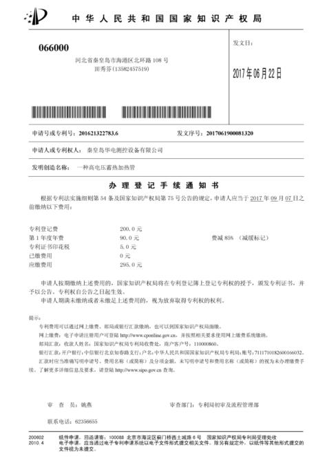 【企業(yè)要聞】喜訊:公司申請的“一種高電壓蓄熱加熱管”專利授權