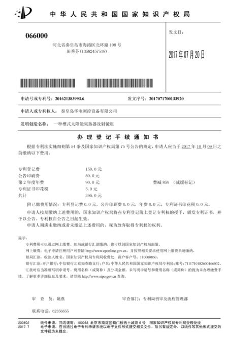 公司于2016年12月16日提交的“一種槽式太陽能集熱器反射鏡組”(專利號:201621383993.6)專利已被中華人民共和國國家知識產(chǎn)權(quán)局授予專利權(quán)。此項專利的授權(quán),標(biāo)志著公司已經(jīng)擁有39項自主知識產(chǎn)權(quán)。