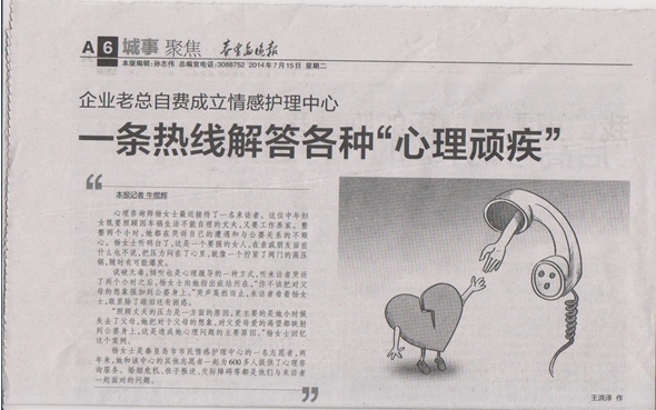 總經(jīng)理劉吉川先生的這一善行,受到了社會(huì)各界的廣泛關(guān)注,燕趙都市報(bào)、秦皇島晚報(bào)等各大媒體先后進(jìn)行了采訪和報(bào)道。這也使得秦皇島市市民情感護(hù)理中心更廣泛的為人所知,從而能夠給廣大民眾提供更多的幫助,更好地服務(wù)于人民、服務(wù)于社會(huì),最終為打造積極生態(tài)圈、構(gòu)建和諧社會(huì)、實(shí)現(xiàn)偉大的中國(guó)夢(mèng)貢獻(xiàn)力量!