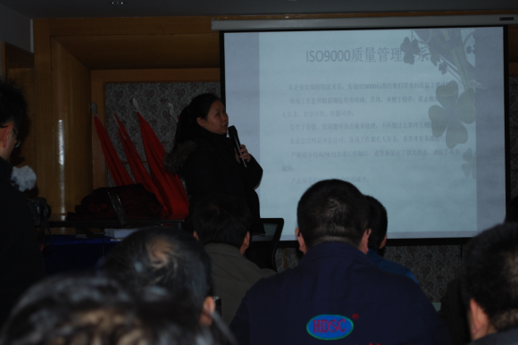 為了使全體員工熟練掌握工作程序并不斷完善、優(yōu)化ISO9001:2008質量管理體系流程,進一步把質量管理體系建設工作向縱深推進,提高質量管理能力,讓公司每名員工都學習、理解ISO9000質量管理體系流程和標準,使基礎管理工作更加標準化、規(guī)范化。3月11日,在公司管理部的組織下于會議室進行了ISO9000質量管理體系――工程部工作流程的培訓,由工程部內審員劉曉娜進行授課。工程部全體人員,生產部、國貿部、管理部、市場部和客服部等部門人員等共34人參加了本次培訓。