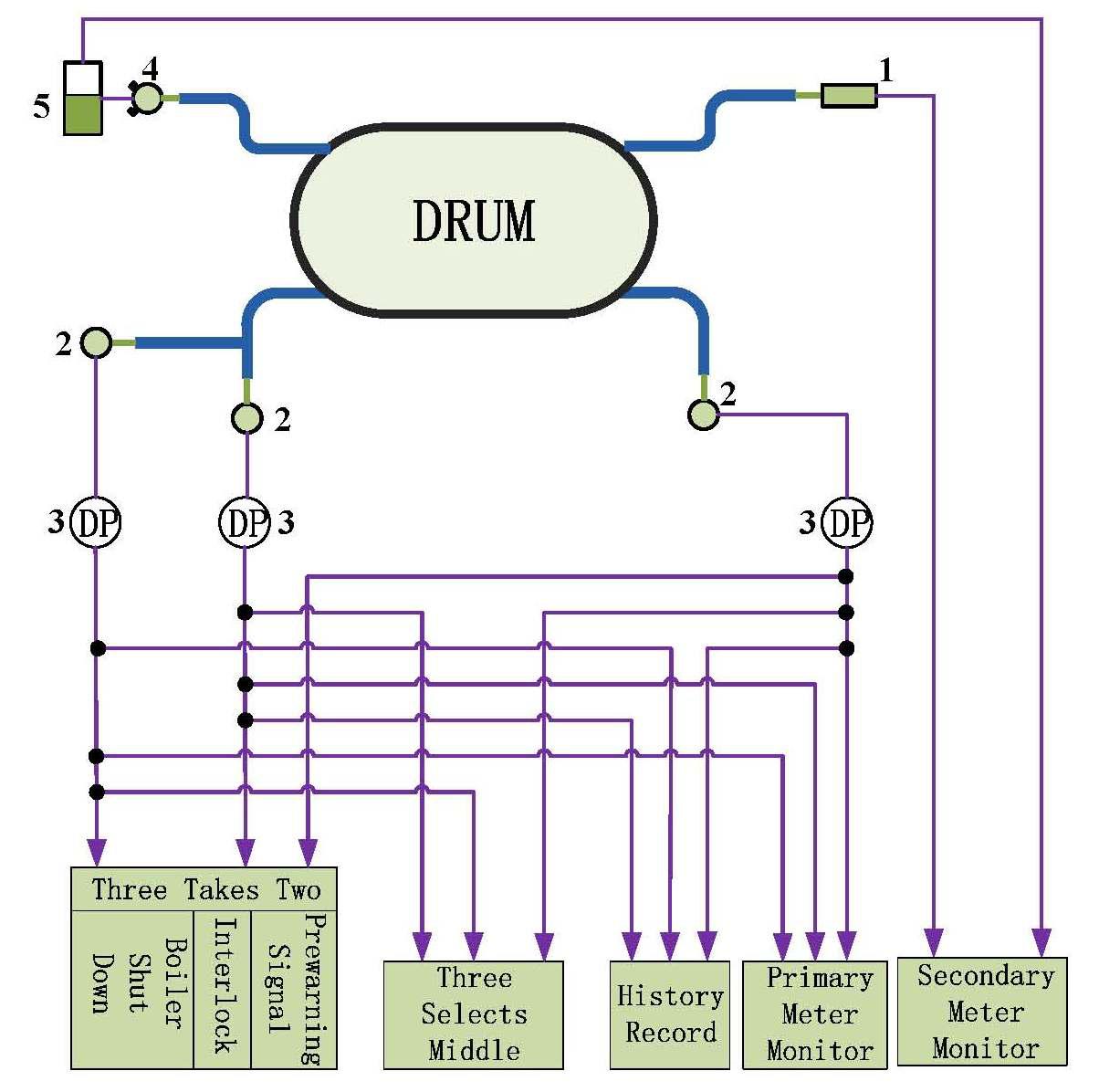 (5)保護系統(tǒng):“三取二”水位停爐、聯(lián)鎖、熱工報警系統(tǒng)信號取自二套電接點水位計和自動調(diào)節(jié)系統(tǒng)“三選中”開關(guān)量輸出信號。