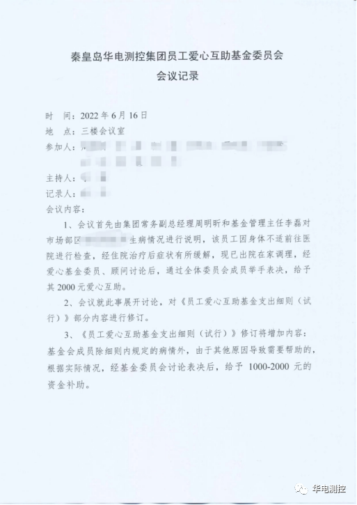 華電測控集團的發(fā)展壯大,離不開每一位員工的辛勤付出!近日,得知市場部某位老員工患病的消息后,集團愛心互助基金委員會迅速組織召開會議,為老員工獻上了一份愛心。