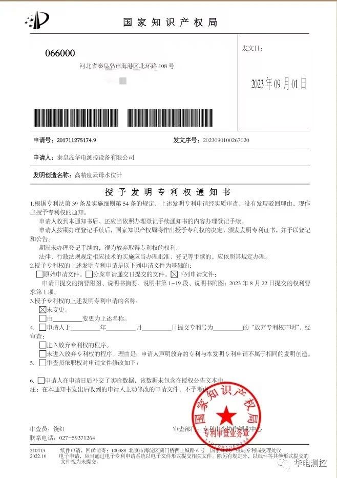 2023年9月1日,秦皇島華電測(cè)控設(shè)備有限公司自主研發(fā)的“高精度云母水位計(jì)”喜獲國(guó)家發(fā)明專利!