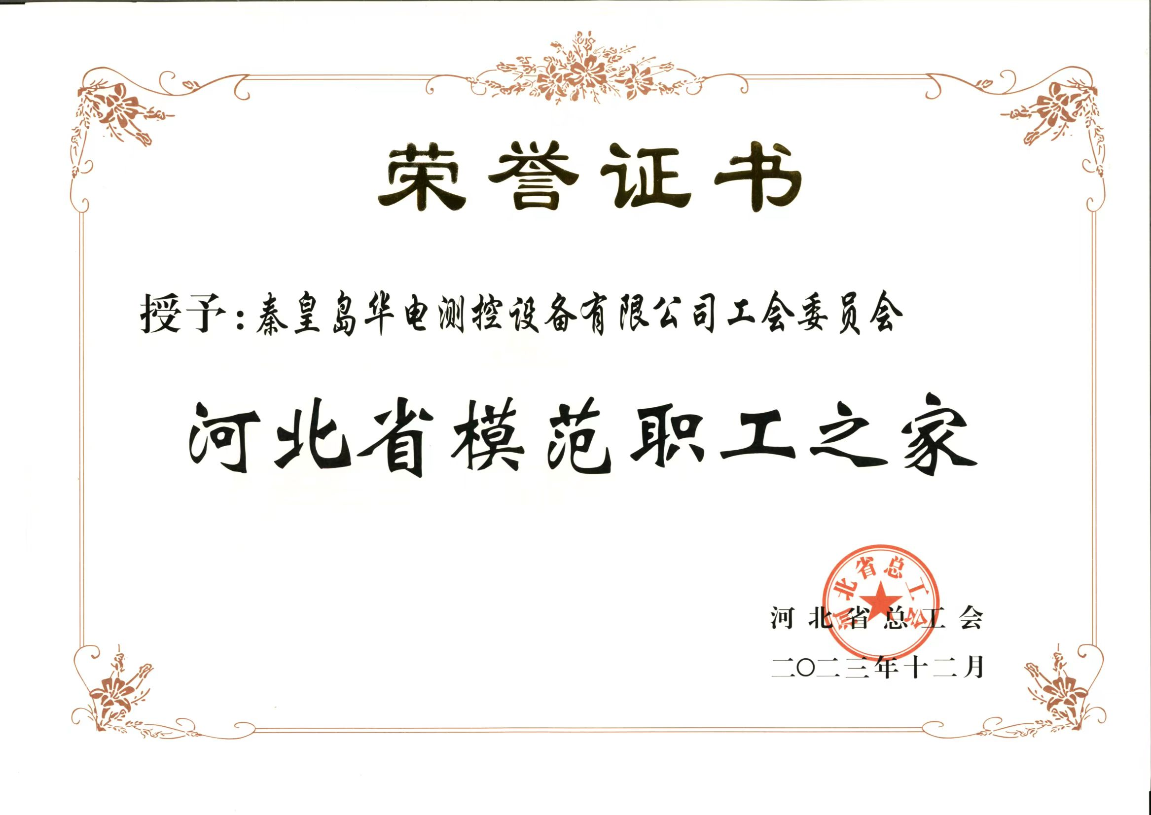 喜報(bào):秦皇島華電測(cè)控設(shè)備有限公司工會(huì)委員會(huì)榮獲 河北省“模范職工之家”榮譽(yù)稱號(hào)