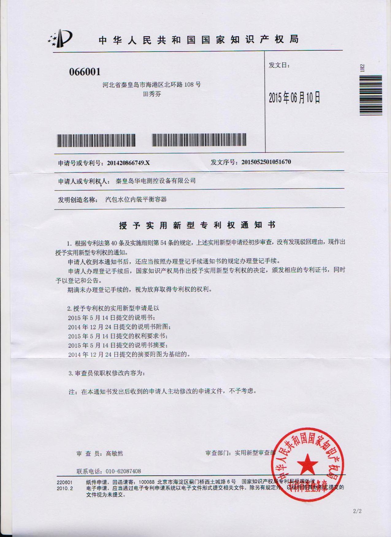 公司于2014年12月24日提交的“汽包水位內(nèi)裝平衡容器”專利已被中華人民共和國(guó)國(guó)家知識(shí)產(chǎn)權(quán)局授權(quán)實(shí)用新型專利權(quán)。