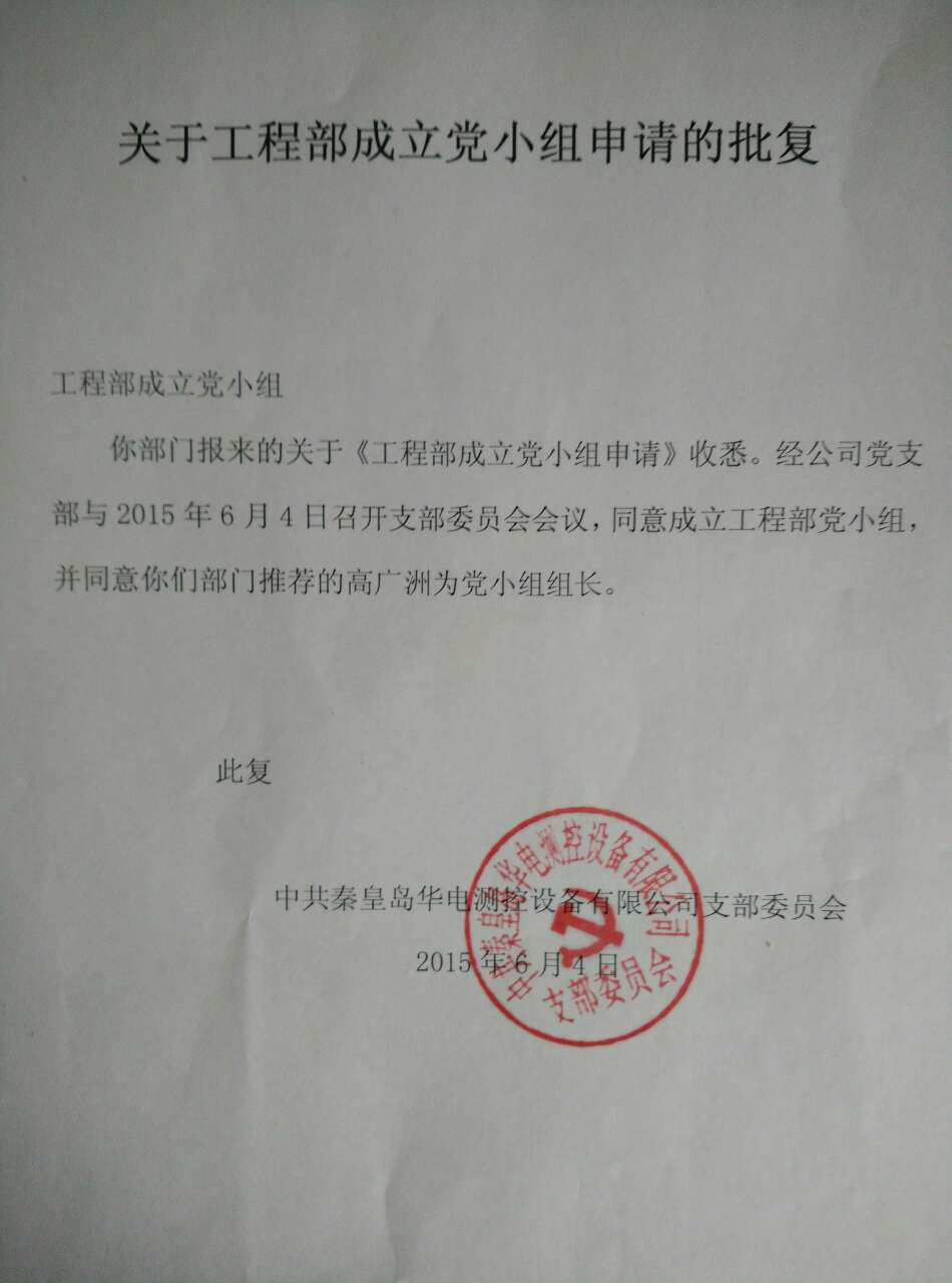 秦皇島華電測(cè)控設(shè)備有限公司黨組織同意工程部成立黨小組的批復(fù)