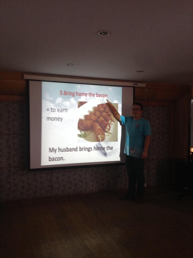 第一個環(huán)節(jié)大家學(xué)習(xí)了“與食物有關(guān)的俗語”。通過觀看大屏幕上吸引人的照片,他們學(xué)習(xí)了十個與食物有關(guān)的英語俗語。比如piece of cake(容易的事情), to go bananas(變瘋狂了), bring home the bacon(賺錢), have bigger fish to fry(有更重要的事情要做),like two peas in a pod(很相似), eat like a horse(很能吃), as red as a cherry(非常紅)……下一個環(huán)節(jié)是口語學(xué)習(xí)。這次他們學(xué)習(xí)了如何表達(dá)“感謝”和“對不起”以及如何回答別人的感謝和抱歉。在英語中我們有時可能會混淆回答“謝謝”和“對不起”的答語。在這個環(huán)節(jié)過后,大家對他們的區(qū)別有了更深的了解。最后他們做了一個簡單的測驗,檢驗一下他們是否在英語角有所收獲。