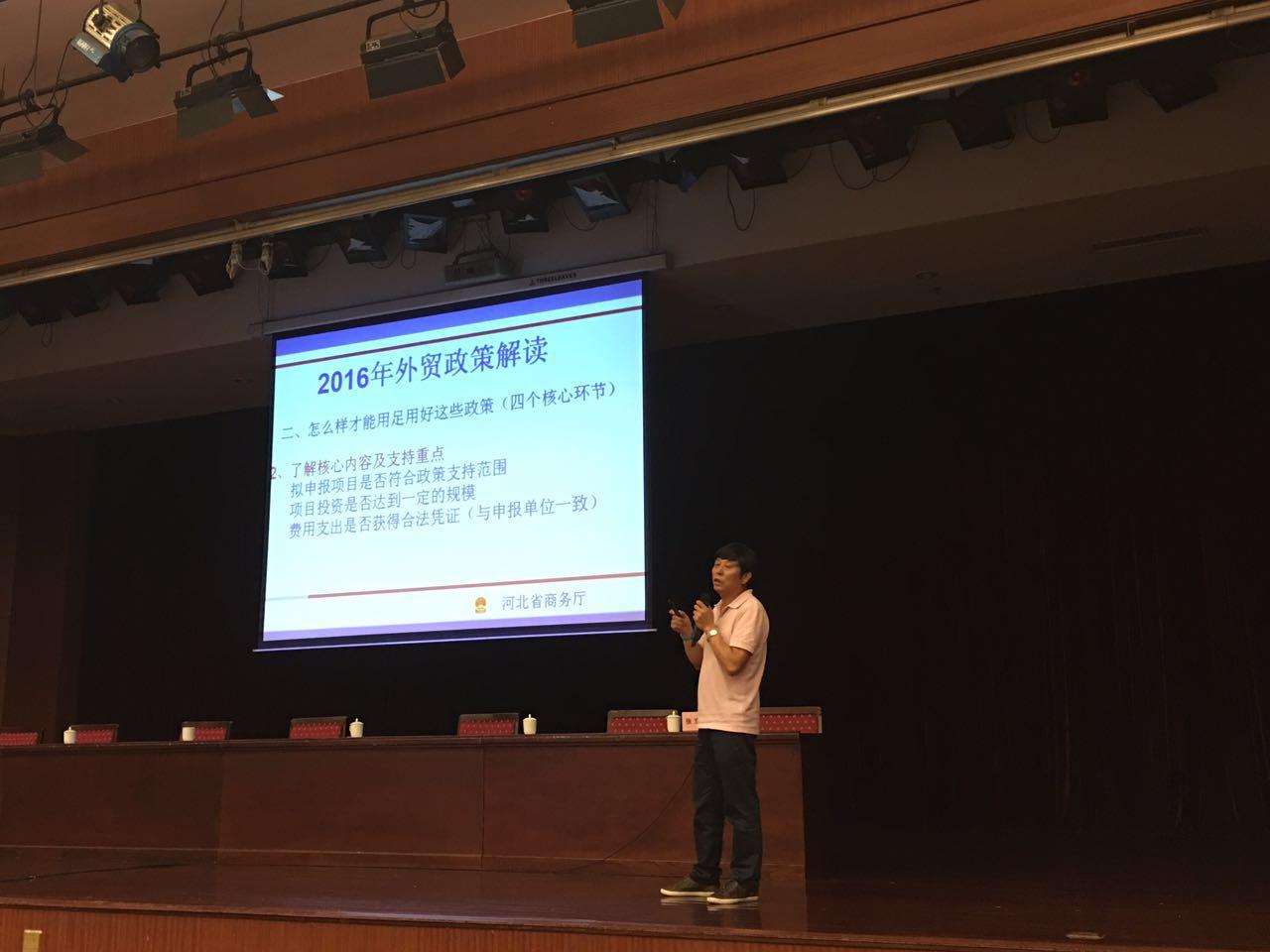 本次主題培訓(xùn)在秦皇島大酒店舉辦。培訓(xùn)的第一課是由省商務(wù)廳外貿(mào)處處長(zhǎng)權(quán)奇衡解讀了國(guó)務(wù)院《關(guān)于促進(jìn)外貿(mào)回穩(wěn)向好的若干意見》和省政府辦公廳《關(guān)于 2016年全省外貿(mào)攻堅(jiān)行動(dòng)方案的通知》,他詳細(xì)解讀了國(guó)務(wù)院和我省為了加快培育外貿(mào)競(jìng)爭(zhēng)新優(yōu)勢(shì)的相關(guān)政策;接下來來自省貿(mào)促會(huì)展覽部的王曉曼部長(zhǎng)講解了出國(guó)展覽及國(guó)際市場(chǎng)開拓,她詳細(xì)地為大家講解了出國(guó)展覽的相關(guān)注意事項(xiàng)以及如何利用展覽去開拓國(guó)際市場(chǎng);隨后省國(guó)稅局進(jìn)出口處副處長(zhǎng)王翠蓮為我們解讀了出口退稅相關(guān)政策,介紹了退稅流程和相關(guān)最新退稅手續(xù);省外匯管理局經(jīng)常項(xiàng)目處主任科員于慶榮講解了貨物貿(mào)易外匯管理業(yè)務(wù);秦皇島海關(guān)稽查科科長(zhǎng)王素素解讀了海關(guān)企業(yè)信用管理暫行辦法,同時(shí)中信保河北分公司處長(zhǎng)助理孫東坡解讀了出口信保的相關(guān)政策;最后阿里巴巴秦皇島負(fù)責(zé)人賈東華為我們講述了“大數(shù)據(jù)讓中國(guó)外貿(mào)更美好”的課程,介紹了大數(shù)據(jù)時(shí)代的機(jī)遇與挑戰(zhàn)。