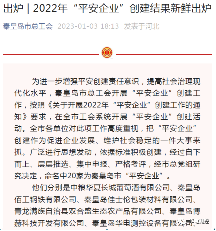 秦皇島華電測控設(shè)備有限公司被命名為2022年秦皇島市“平安企業(yè)”” 2023-01-212022年,為進一步增強企業(yè)安全生產(chǎn)主體責(zé)任和全員安全責(zé)任意識,有效提升企業(yè)安全管理水平,秦皇島華電測控設(shè)備有限公司響應(yīng)秦皇島總工會開展的“平安企業(yè)”創(chuàng)建工作,按照《關(guān)于開展2022年“平安企業(yè)”創(chuàng)建工作的通知》要求,打造高標(biāo)準(zhǔn)“平安企業(yè)”。經(jīng)過嚴(yán)格考評,秦皇島華電測控設(shè)備有限公司被秦皇島市總工會命名為2022年秦皇島市“平安企業(yè)”。More