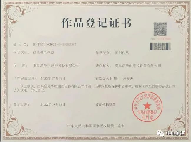 熱烈祝賀華電測(cè)控知識(shí)產(chǎn)權(quán)再添一員” 2022-10-262022年9月26日,秦皇島華電測(cè)控設(shè)備有限公司收到中華人民共和國(guó)國(guó)家版權(quán)局頒發(fā)的《儲(chǔ)能供電電路——作品登記證書》。